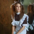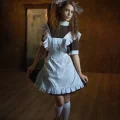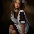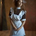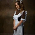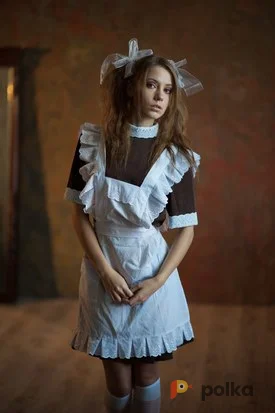 Платье из плотной НЕ мнущейся ткани с содержанием лайкры, НЕ трикотаж. Прекрасно садится на любую фигуру. Отрезное по бедрам, низ платья сделан в виде крупных складок. Длина-чуть выше колена. Застежка потайная молния сзади. Нарядный фартук из белого атласа или хлопка.