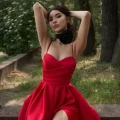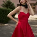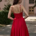 Вечернее красное атласное платье Айруза на бретелях на корсете. Длина миди (7/8). Размер 42-46.
